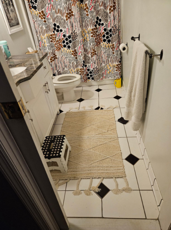 At first glance, the photo shows nothing more than a clean bathroom with a patterned shower curtain, white cabinets, a beige rug, and black-and-white tiled flooring.