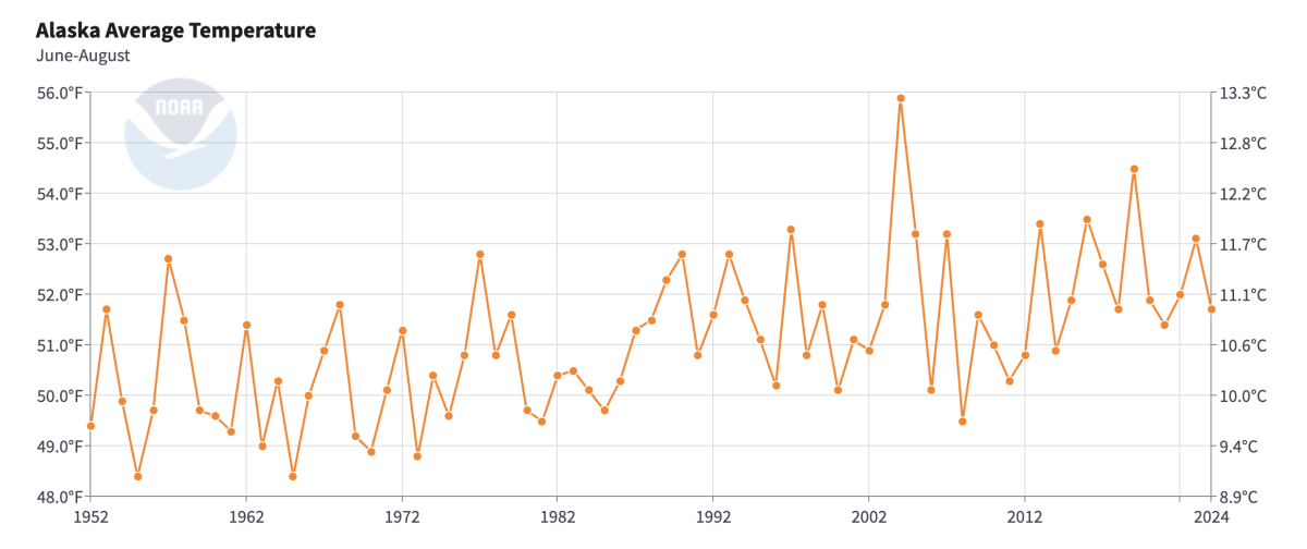 Data from the National Weather Service reveals a steady rise in Alaska’s average temperatures during the summer months of June through August. Image Source: National Centers for Environmental Information.
