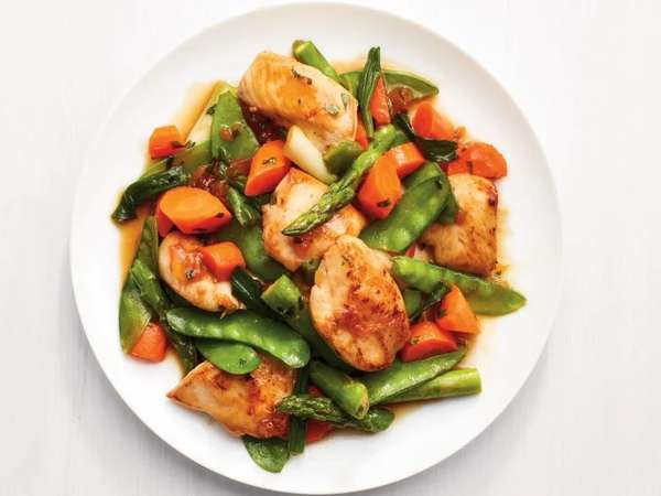 Stir in asparagus, snow peas, and ¼ teaspoon salt. Cover and cook about 3 minutes, until veggies are crisp-tender. - Return chicken to the skillet. Stir in apricot preserves, Dijon mustard, scallions, tarragon, and lemon zest.