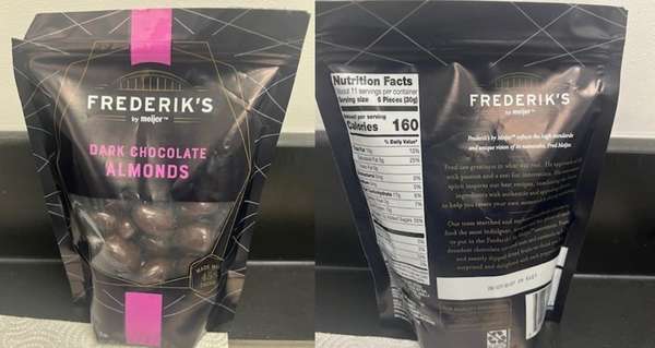 Frederik’s Dark Chocolate Almonds have been recalled in six US Midwest states after it was discovered they may contain undeclared cashews, which can pose a life-threatening risk to people with allergies. Image source: FDA.