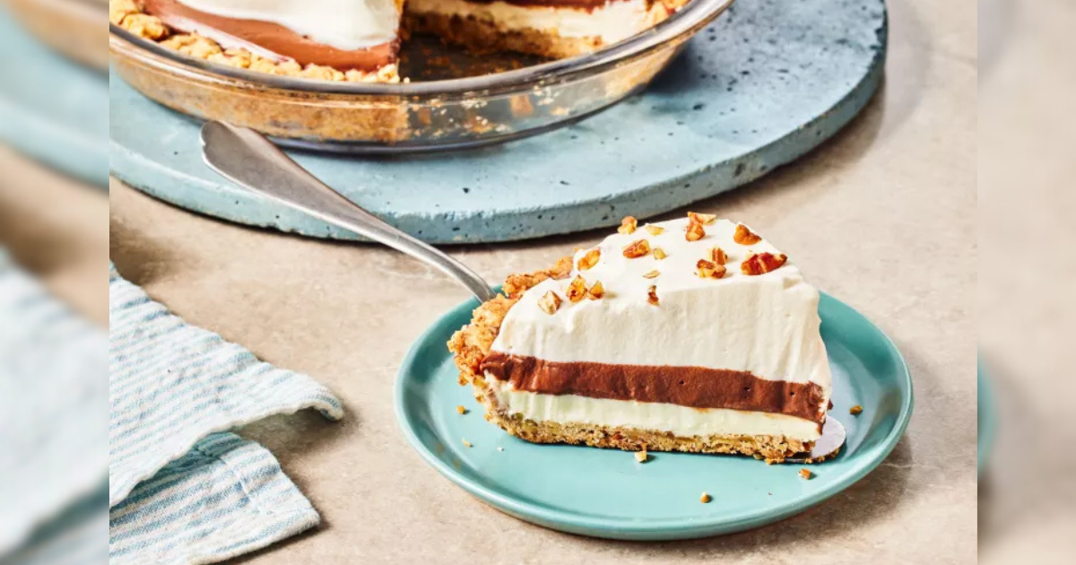 - Assemble the pie: Spread the cream cheese filling into the bottom of the cooled pecan crust, smoothing it into an even layer. Pour the chocolate filling evenly over the cream cheese filling. Press a sheet of plastic wrap directly onto the surface of the chocolate filling. Chill until pie is set, at least 6 hours or up to 2 days.