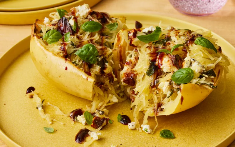 This Baked Spinach & Feta Spaghetti Squash is an elegant, veggie-loaded twist on pasta night. A block of feta and vibrant baby spinach roast right inside a halved spaghetti squash, infused with garlic and herbs, then finished with a tangy balsamic glaze for a perfect balance of creaminess and brightness. Vegetarian, gluten-free, and big on flavor.