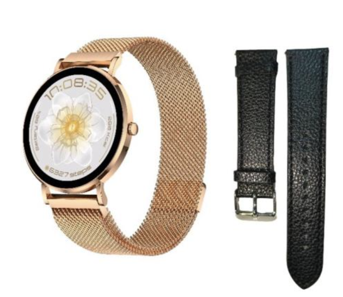 The watch featured a 1.68-inch color touchscreen, came with two bands (one bejeweled and one mesh), and was promoted with health-tracking features like oxygen level monitoring, sleep tracking, heart rate, and multiple sports modes.