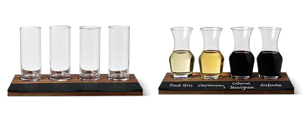 The set includes four glasses—choose between 6.25-ounce wine glasses or 6.67-ounce beer glasses—cradled by a wooden board with a convenient chalk area. This feature allows you to label each beverage, making it a fun and interactive experience for everyone involved.