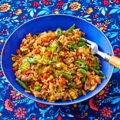 In a large deep skillet, warm sesame oil over medium-high heat. Cook the white and pale green scallion parts, stirring frequently, until tender (2-3 minutes). Mix in ground pork, minced ginger, and garlic, breaking up the meat as it browns until fully cooked (5-6 minutes). - Combine Rice & Seasonings
