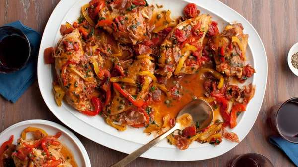 - In the same pan, cook the peppers and prosciutto over medium heat until the peppers brown and the prosciutto crisps up, about 5 minutes. Add garlic and cook for 1 more minute. Stir in tomatoes, wine, and herbs, scraping up any browned bits from the pan with a wooden spoon. Return the chicken to the pan, add stock, and bring to a boil. Lower the heat, cover, and simmer for 20 to 30 minutes until the chicken is fully cooked.