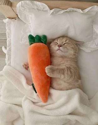 How adorable is this cozy kitty snuggled up with its carrot? I wonder what it's dreaming about—maybe fields of catnip or a garden full of tasty treats! The way it holds that stuffed carrot like it’s the most precious thing in the world is absolutely endearing. It’s hard not to smile at this sweet scene! Share photos of your lovely pets here and we’ll feature them next!