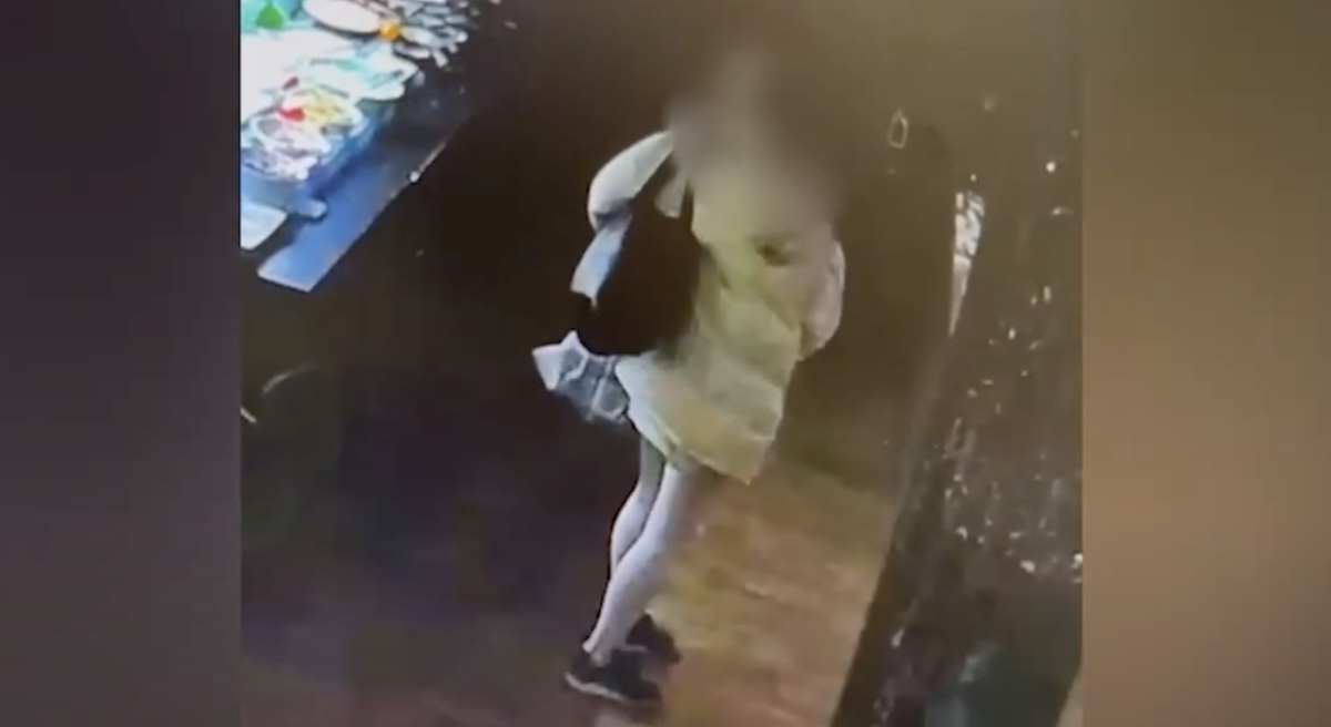 CCTV footage suggests a woman entered the bathroom with an empty bag and left with it bulging, implying she took the sink valued at $190.19. Image source: SWNS / Youtube.