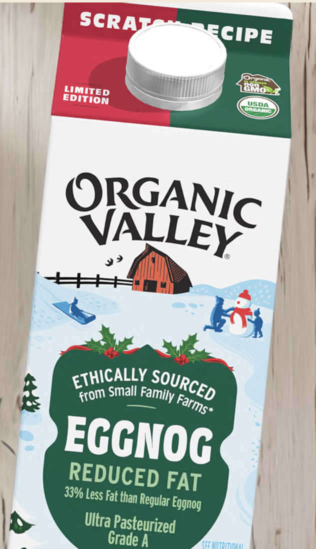 Organic Valley Eggnog: Light, creamy, and spiced to perfection with organic ingredients for a wholesome holiday treat. Image Source: Organic Valley.