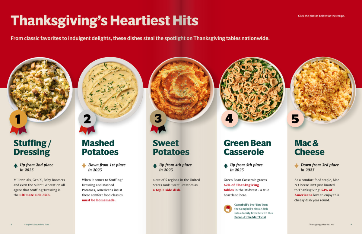 - Campbell's annual State of the Sides report finds that over 55% of Americans prefer side dishes over turkey at Thanksgiving.