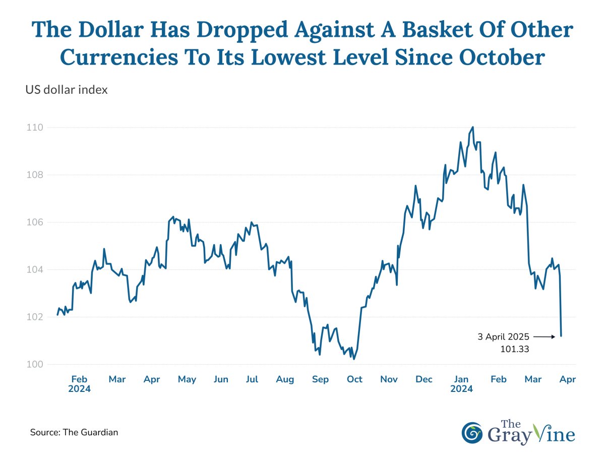 Meanwhile, the US dollar plunged 2.2% during Thursday morning trading to a six-month low, reflecting eroding confidence in what had long been viewed as the world’s safest currency.