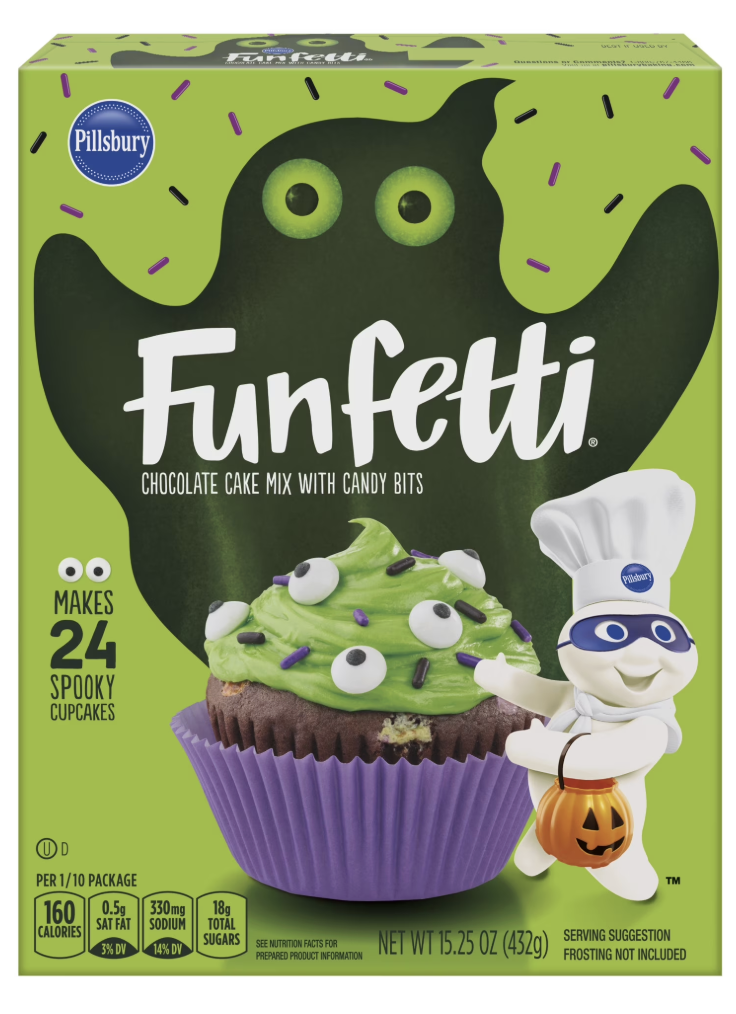 A spooky baking kit complete with cake mix, green “slime” frosting, and eyeball sprinkles. Image Source: Walmart.